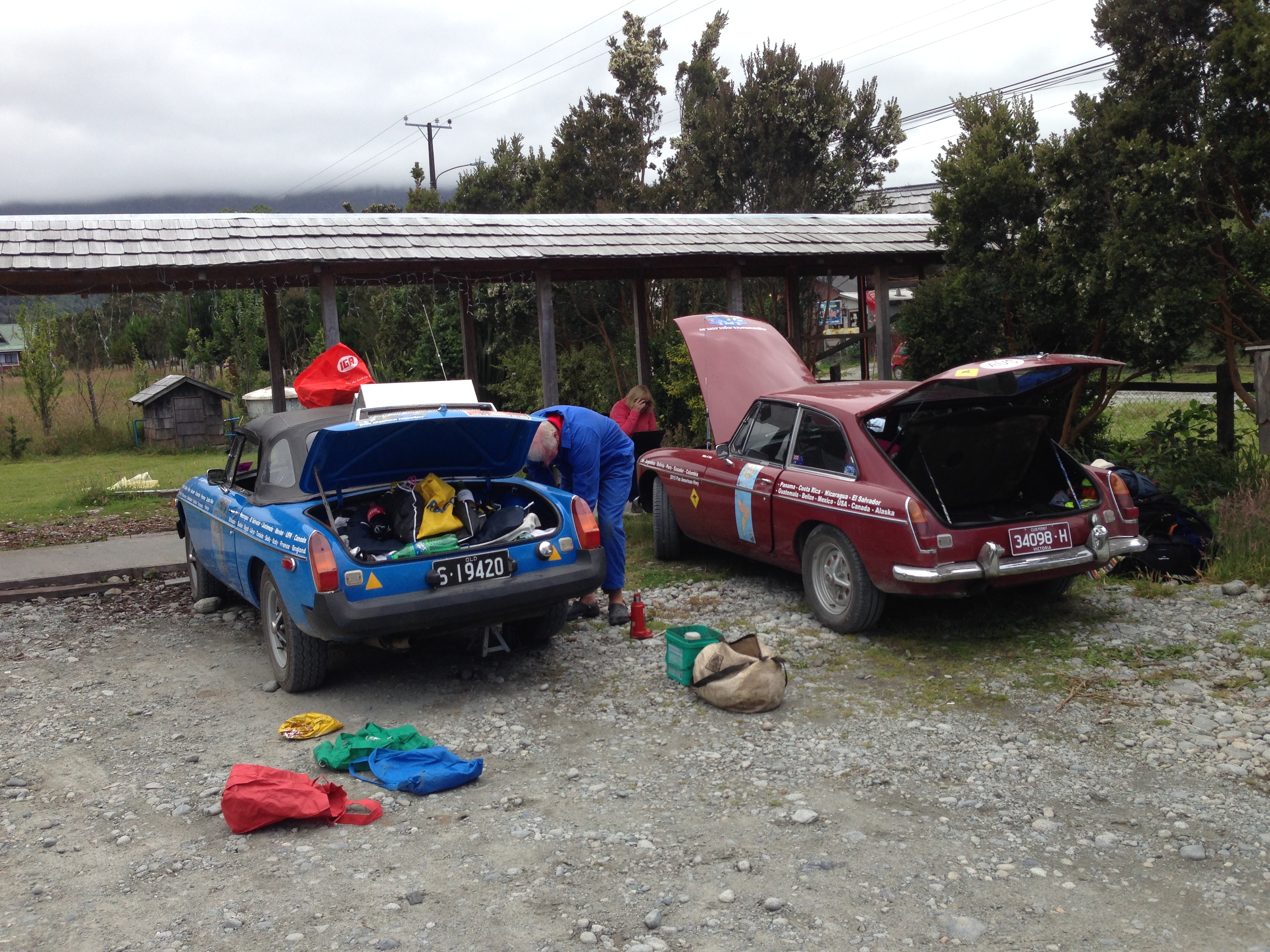 At last , the end of the day is nigh as we find the secure fenced area in seemingly the middle of nowhere to leave the MGs and transfer in two boats to the AMAZING Puyuhuapi Lodge and Spa .(www.bob.travel votes it as one of the 10 best places to stay in Chile)