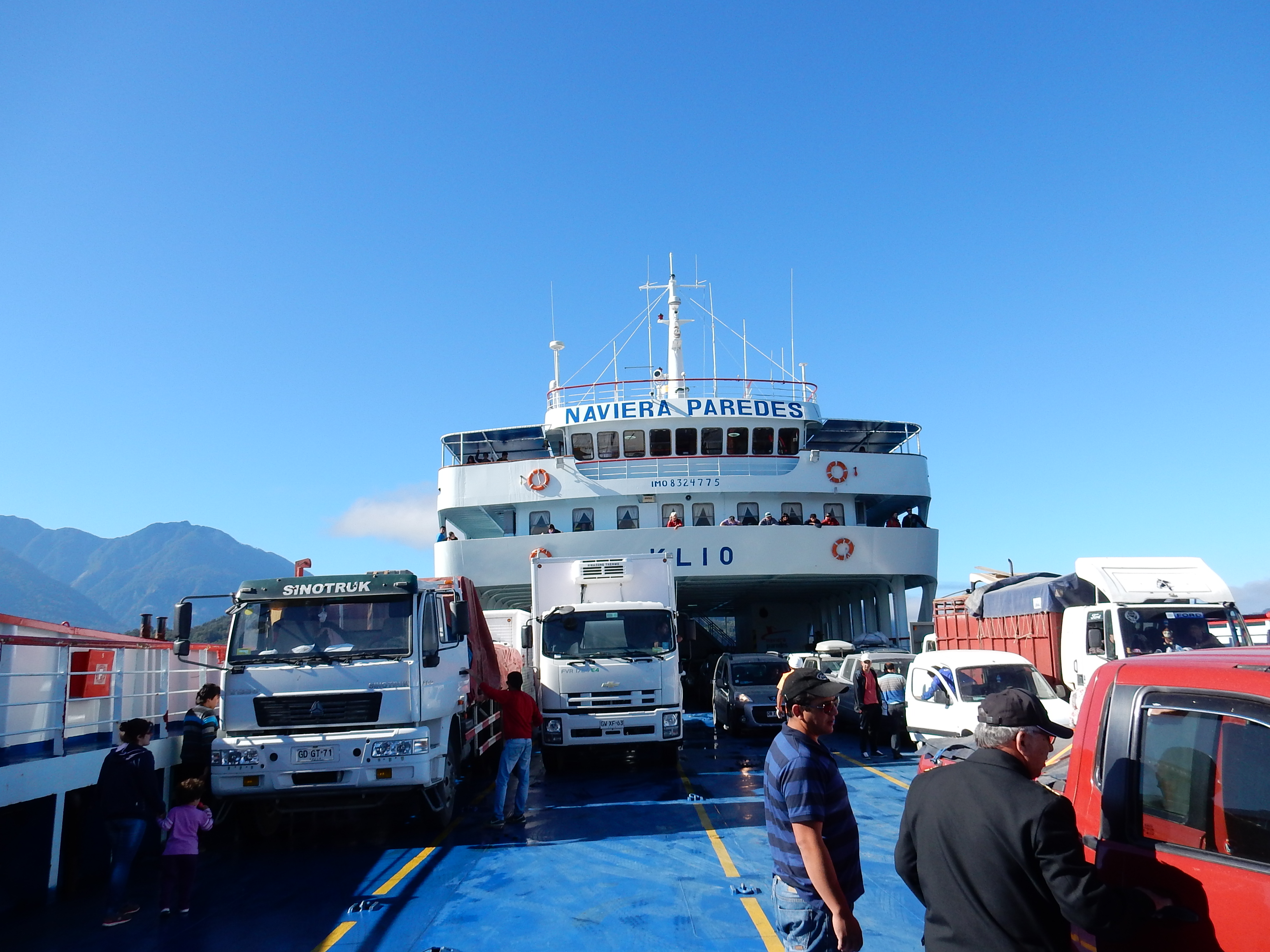 9,00 am embarked on a large ferry ‘Kilo’ haveing said fond farewell to Guy and Andrea and crazily waved as the ferry left the slipway at Hornepirenat 10.00 am for the approx 3 hour journey through Chile fjords to Leptepu.